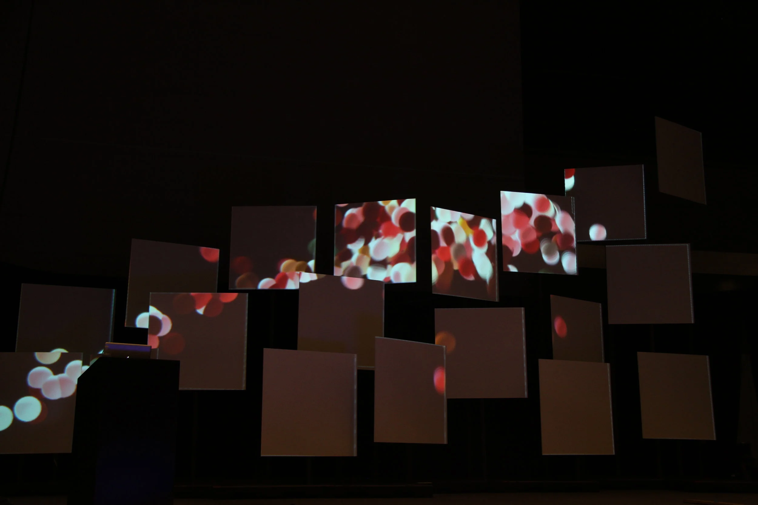 “Interactive stage art pulls images from Twitter in real time and adds pixels to floating visualization that visitors can interact with”.